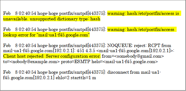“/etc/postfix/access”のアクセスで“hash”タイプのディレクトリがサポートされていない